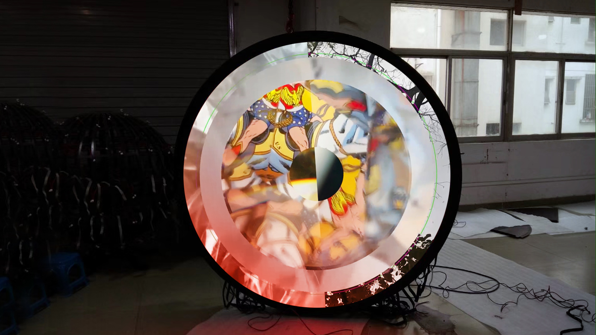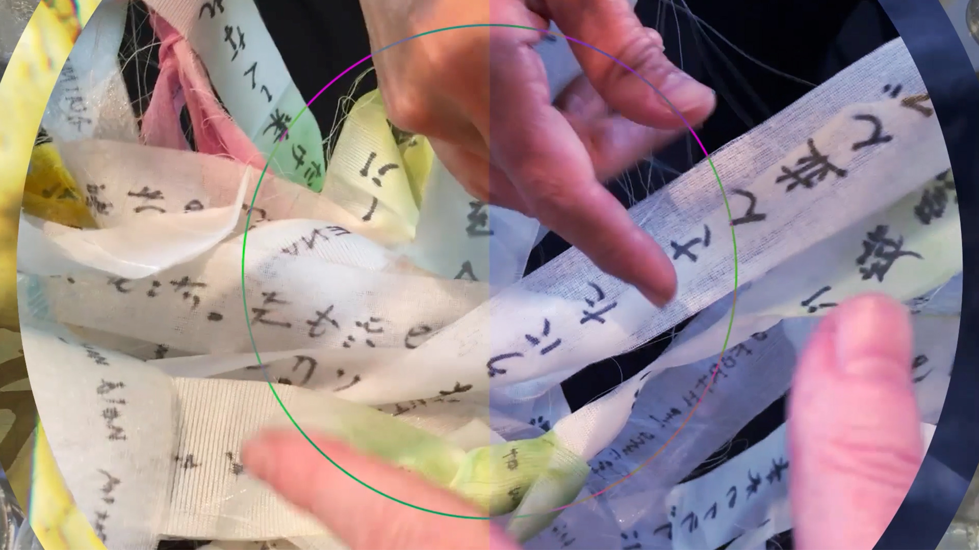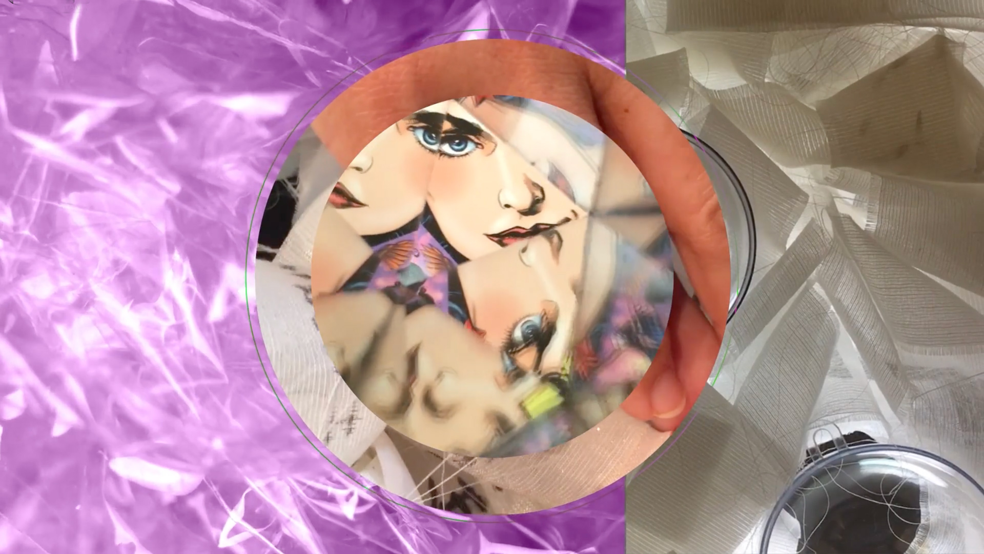 JUNA AMANO and C.G. RYAN collaborated earlier to create in interactive sculpture with intertwined strands of fabric with each of their most significant life events (Phase 1). When they received an invitation to create an installation at the WOW (Women On Women) show at 400 W Rich, they decided to create a multimedia installation that told the story of their relationship, with a circular hanging projection screen with a kaleidoscope view and a standing monitor that used split screens (phase 2)